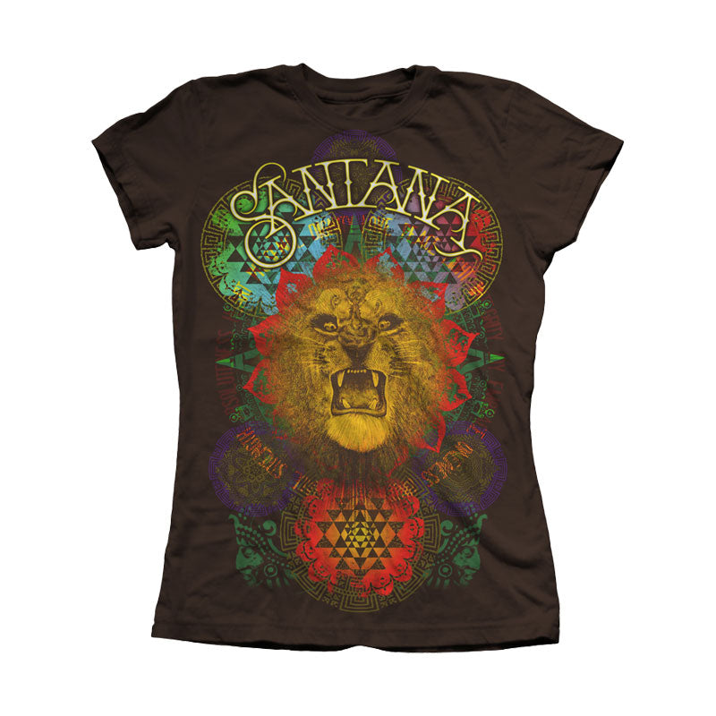 The Santana Lion is roaring through a colorful collage of yantras and mandalas on this fashion fitted junior's cotton blend tee.